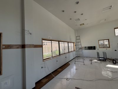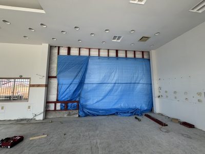 店舗入口まわりなど、一部外壁を撤去しました。改修業者がスムーズに施工できるよう解体範囲を調整しました。