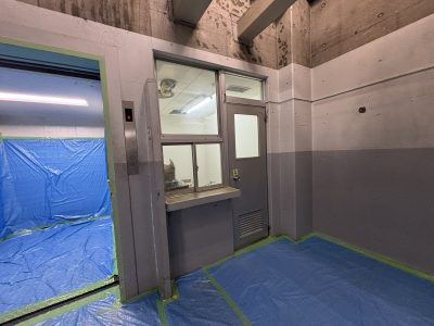 周囲の仕上げや設備を傷つけないよう、養生作業を徹底してから作業を開始しました。