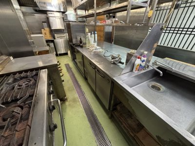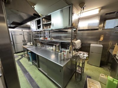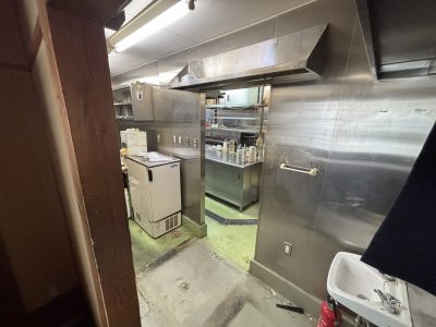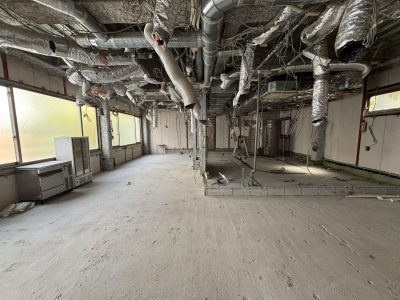 施工内容:内装解体(天井・壁・床の仕上げ材および下地の全面撤去)、厨房機器・什器等の搬出、室内クリーニングなど